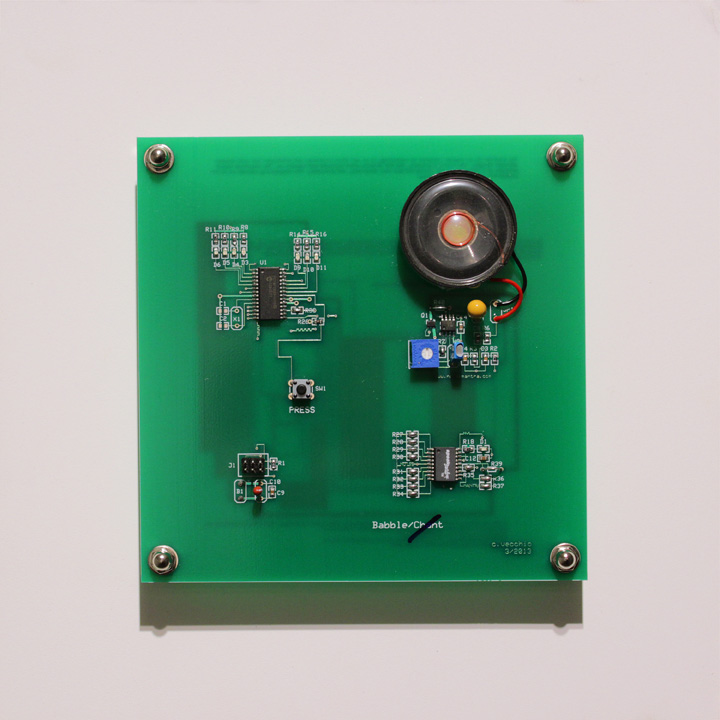 Babble/Chant is based on a small embedding microprocessor and a chip called the "SpeakJet" which is able to synthesize the 72 allophones that make up the English language. The microprocessor randomly assembles sequences of roughly 2-7 of these allophones to create (nonsense) "words", and then strings together a random number of these words to create sentences. Each time the button is pressed, a new, random sentence is generated and spoken when in "Babble" mode. In "Chant" mode sentences are created which are a little heavier on vowel sounds and these are repeated slowly, multiple times to create nonsense "chants".
